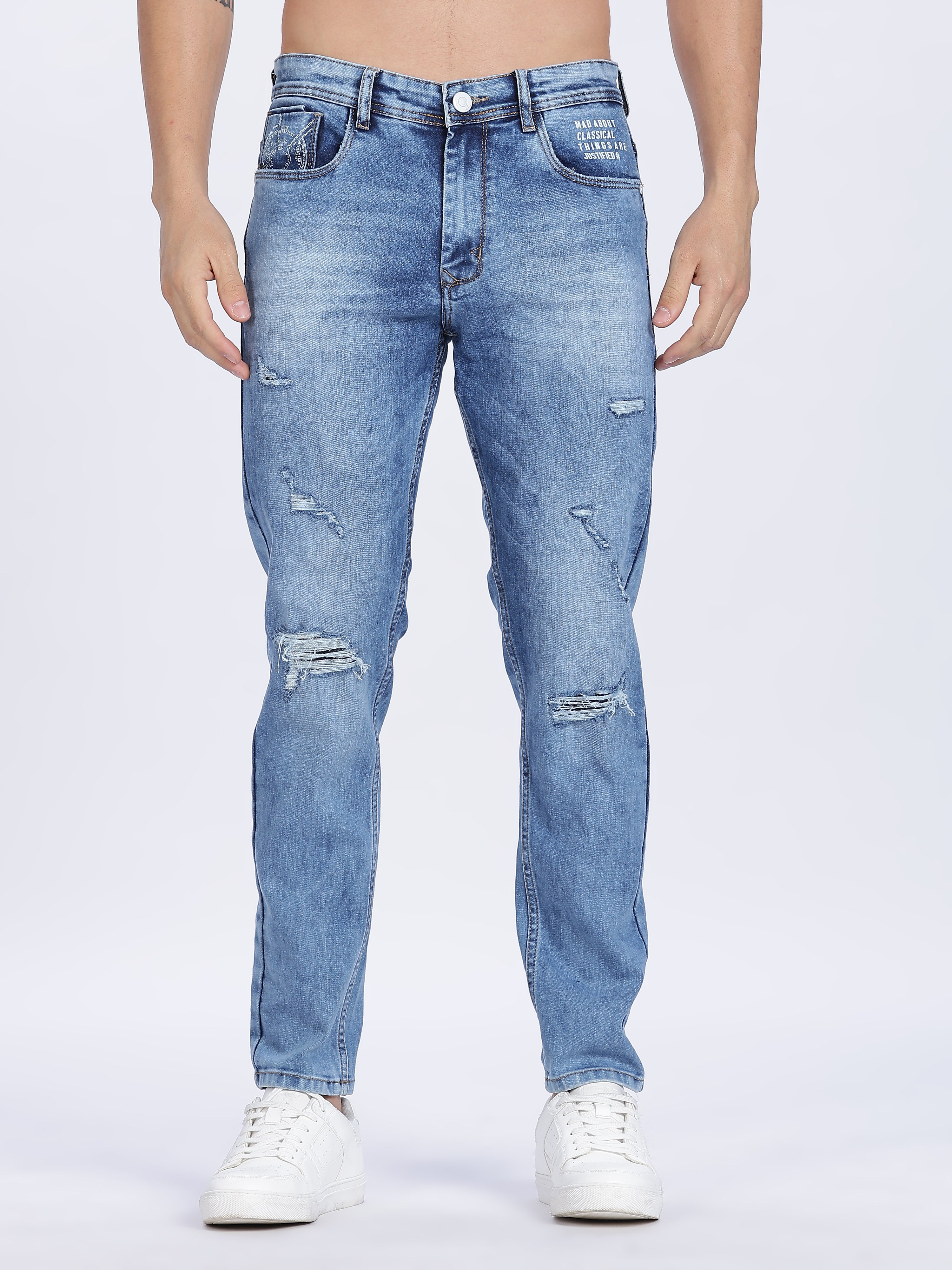 Details: Step up your fashion game with the Color Hunt Men's Blue Ripped Denim Jeans. Expertly crafted from high-quality denim, these jeans promise both style and durability. The full-length design and regular fit provide a classic silhouette that remains comfortable for all-day wear. Featuring a modern ripped pattern, these jeans add an edgy touch to your wardrobe, perfect for expressing your individual style. The button closure ensures a secure fit, making them a reliable choice for any occasion. Whether you're heading to a casual meet-up or a night out with friends, these jeans are your go-to for effortless style. Pair them with a simple tee or a stylish shirt and experience the perfect blend of comfort and fashion.